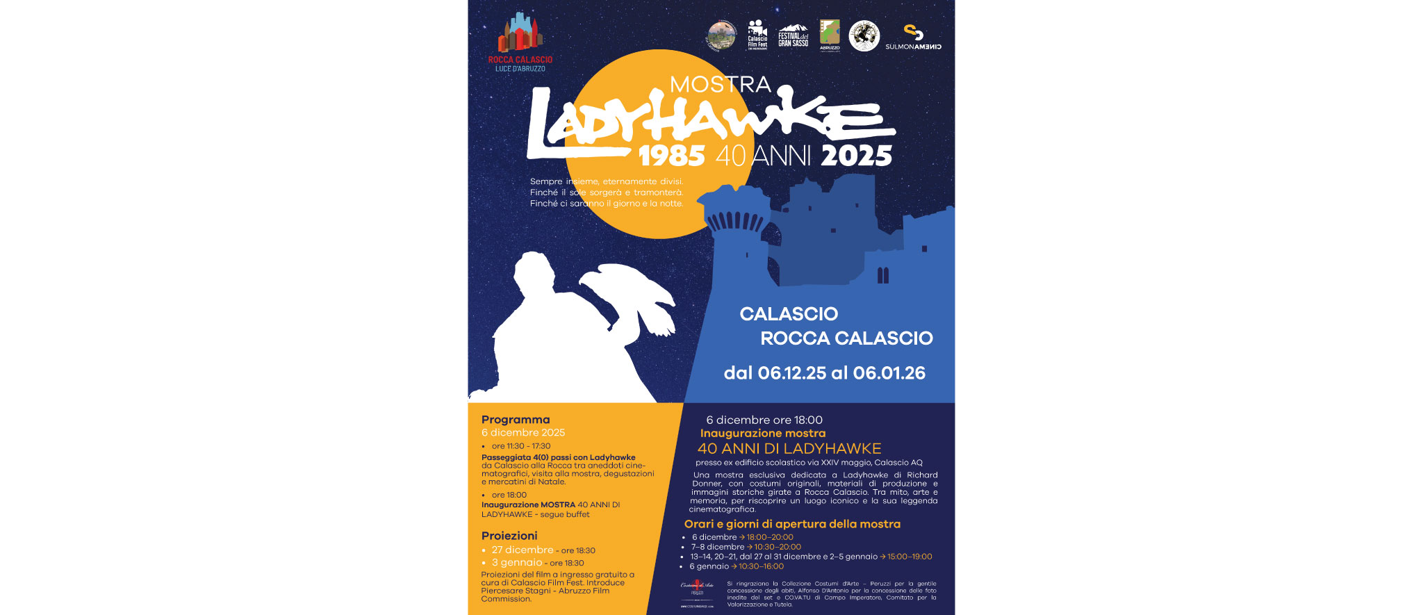 Un grande appuntamento culturale dedicato a uno dei film più iconici girati in Abruzzo e profondamente legato alla storia e all’immaginario di Rocca Calascio. Parliamo della mostra Ladyhawke 1985–2025 – 40 anni, che inaugurerà a Calascio, il 6 dicembre 2025 alle ore 18.00, negli spazi dell’ex edificio scolastico di via…
