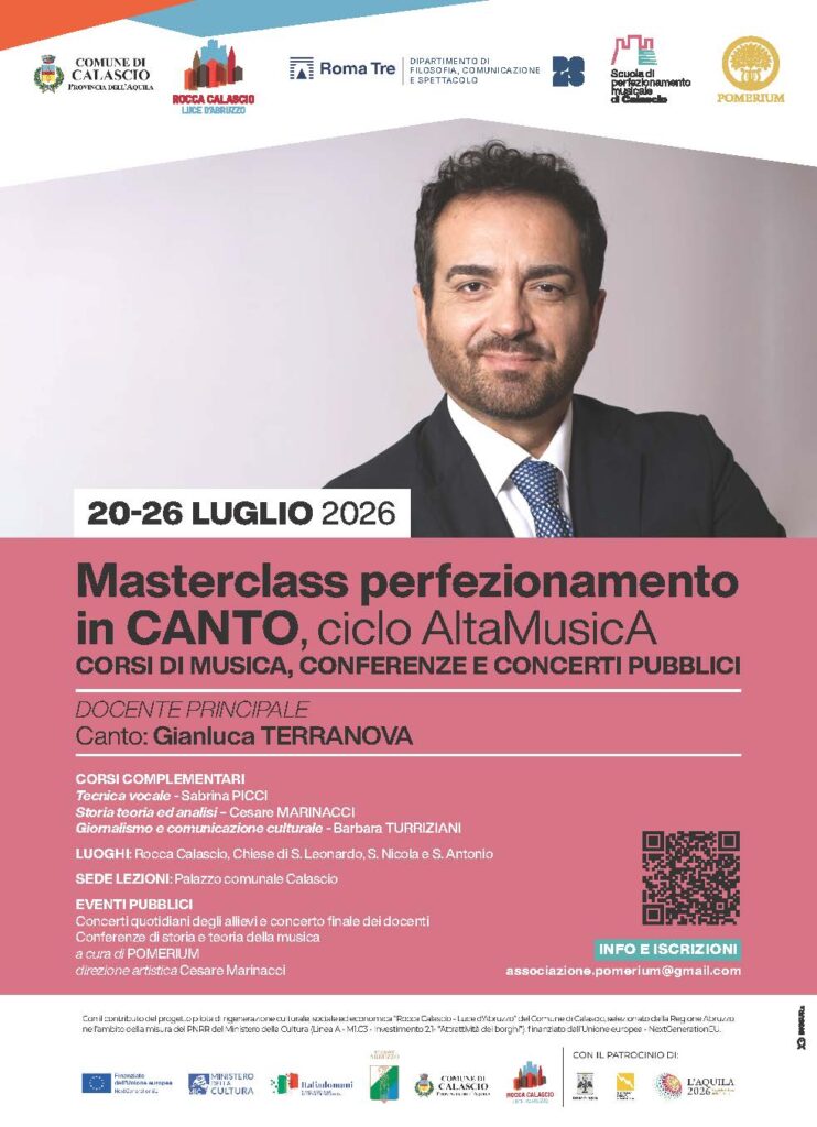 La Scuola di perfezionamento Musicale di Calascio vede come partner di progetto capofila il Dipartimento di Filosofia, Comunicazione e Spettacolo dell’Università Roma Tre insieme a Officina Musicale e Pomerium, ecco la masterclass perfezionamento in canto di luglio: